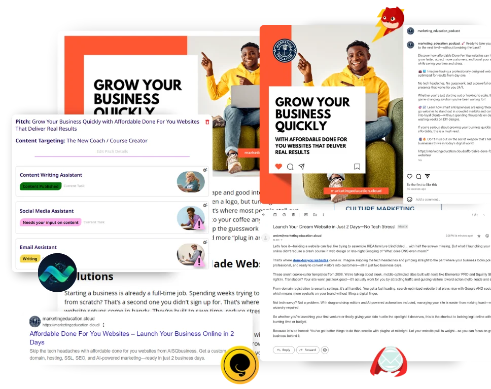 AISQbusiness launches your website and a full marketing infrastructure (+guidance and lessons) in 48 hours — already connected, already working.