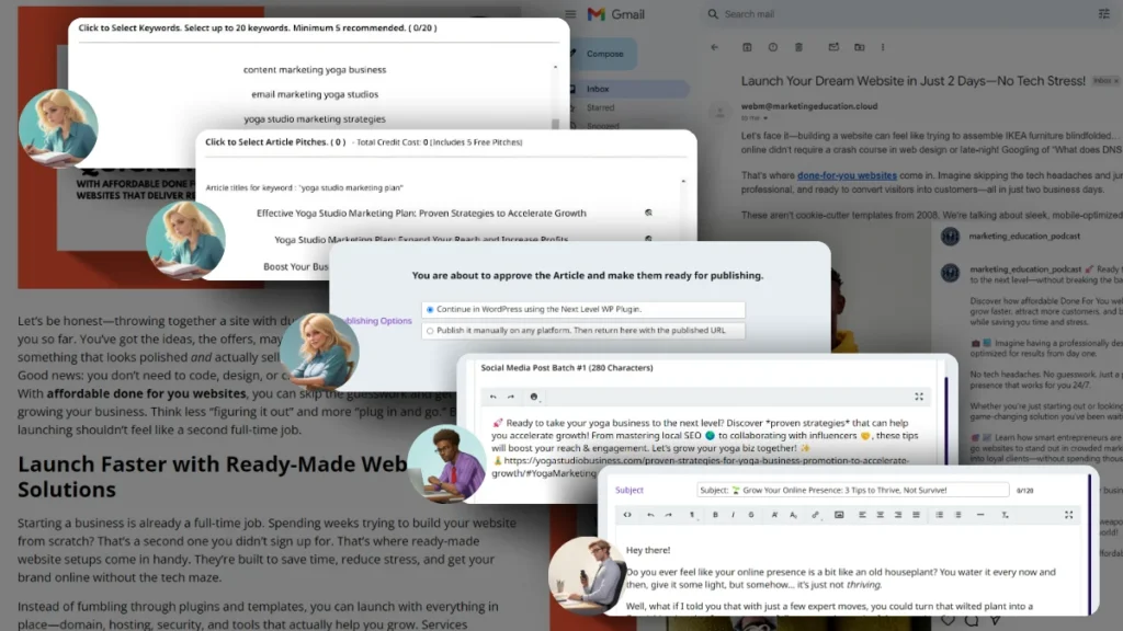 Our current line-up of AI Agents help you orchestrate marketing across: website, Bing, Google, AI Overviews, social media profiles, Google Business profiles, email marketing inboxes, ecommerce product feeds. You will build personal branding and E-EAT, learn marketing from our experts, grow monthly retainers. You will also get a new generation of Chat Bots that your site visitors will actually use. This marketing infrastructure will work for you even if you don’t have a WordPress site.