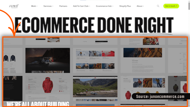 Juno Ecommerce uses striking visuals and a looping slideshow of real ecommerce sites to demonstrate the outcome they promise (before asking you to believe it).