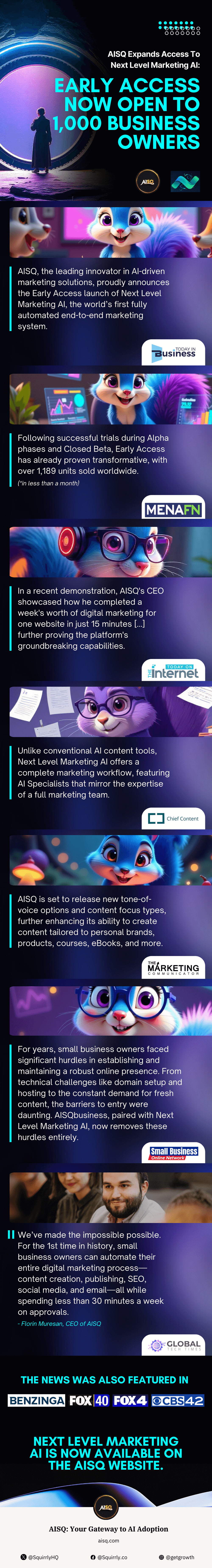 AISQ’s Next Level Marketing AI delivers fully automated, end-to-end marketing solutions, now available to 1,000+ businesses worldwide.
