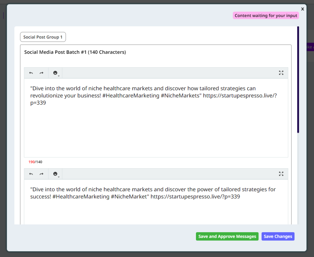 For example, you can have a post group with Instagram Captions, one with Short Twitter/X Posts, one with Facebook Messages, etc.