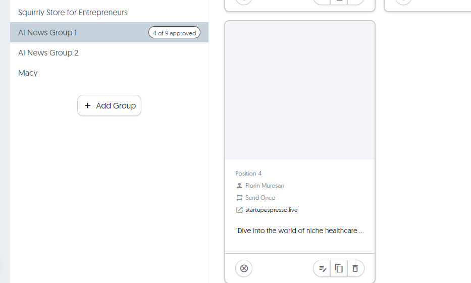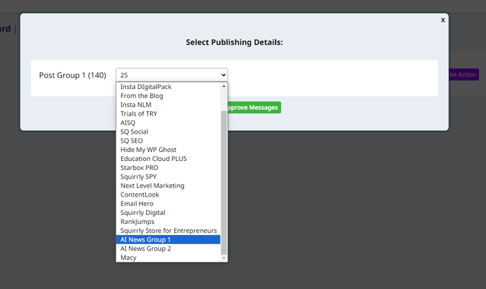 The beauty of it is that you can now select one of your Post Groups from within Squirrly Social. This open the gates for some very advanced social media strategies you may create for your brands.