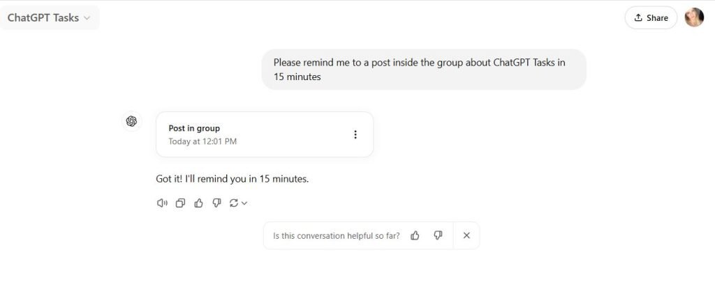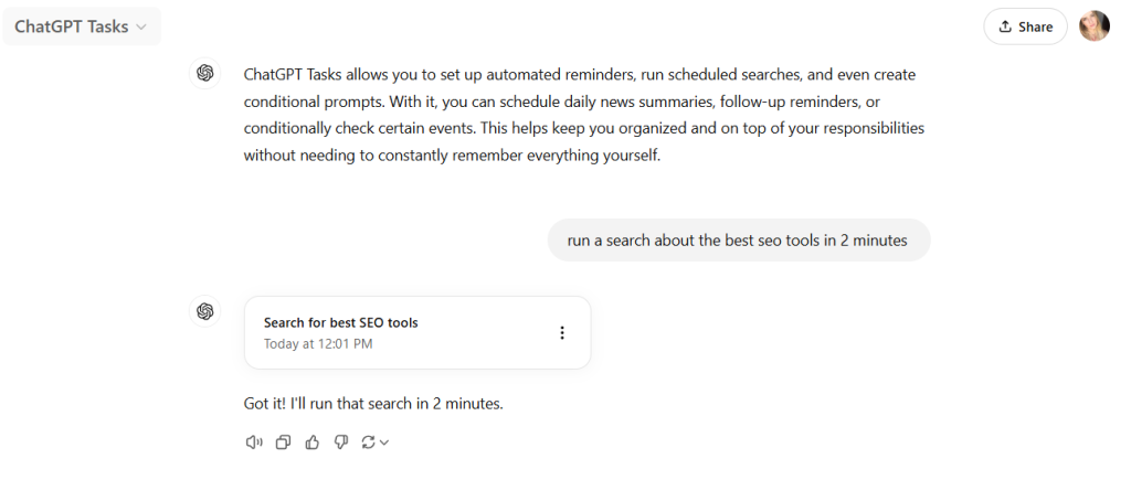 • Tasks enables users to schedule one-time or recurring reminders and actions via ChatGPT.