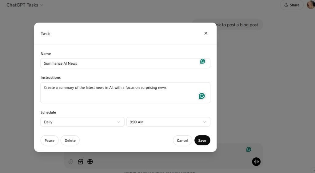 Currently in beta for PlusPro, and Team plans users, “Tasks” lets users schedule reminders and automated actions that are executed by ChatGPT even when the user is offline